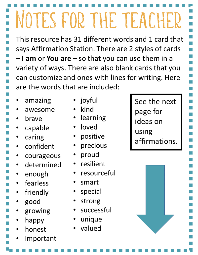 These affirmation station cards are ready-to-go! All you need to do is print them out and cut out the ones you need. You can use all the 31 statements or just pick and choose the ones that are best for your class.